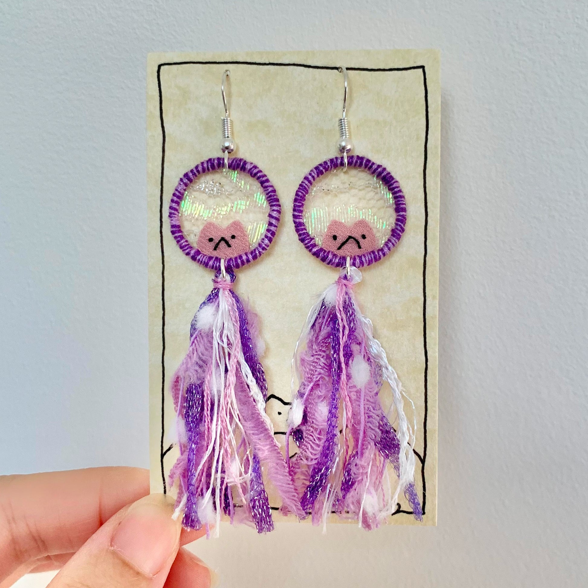 Embroidery E-mo Cat Earrings with tassel (Purple)